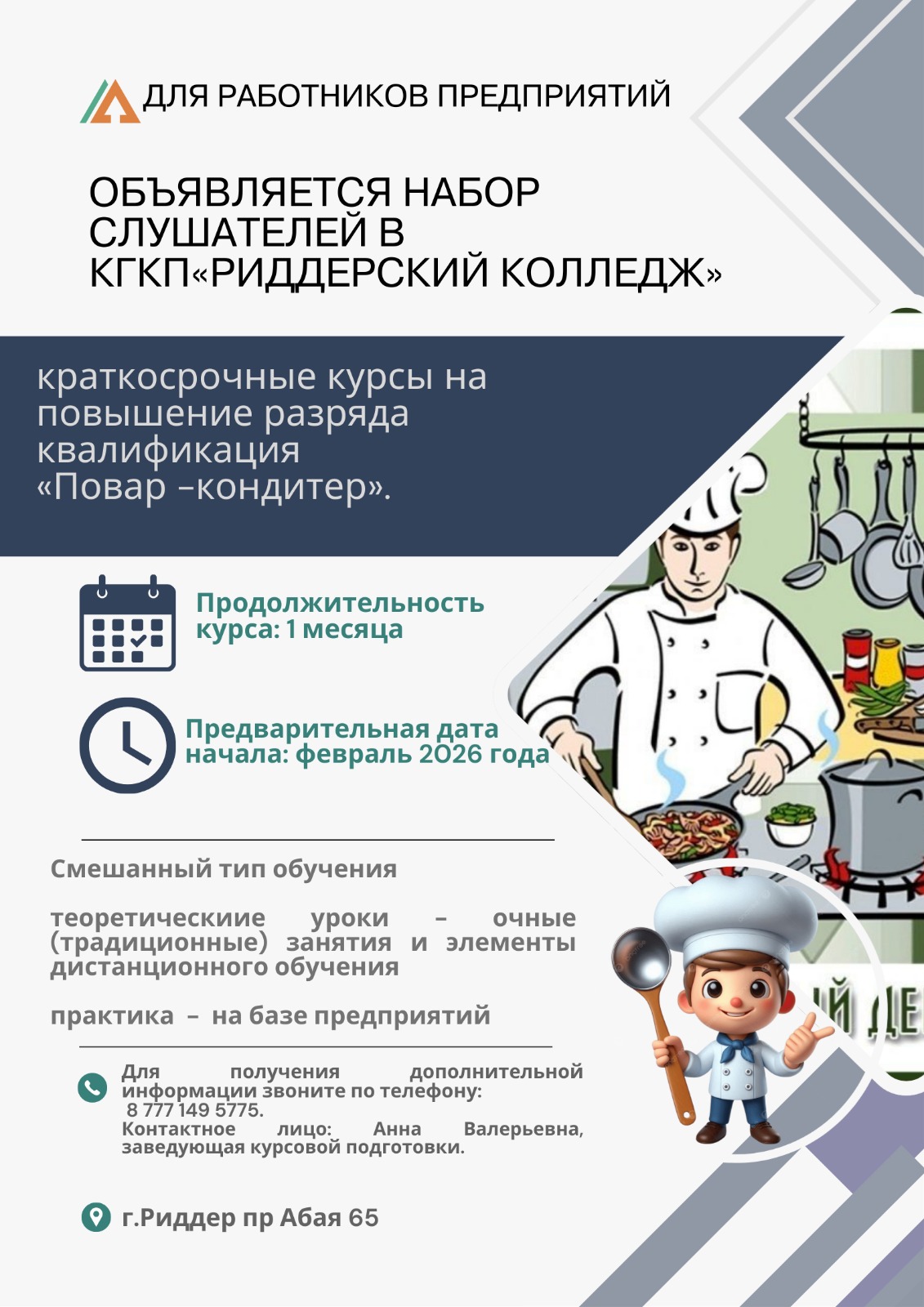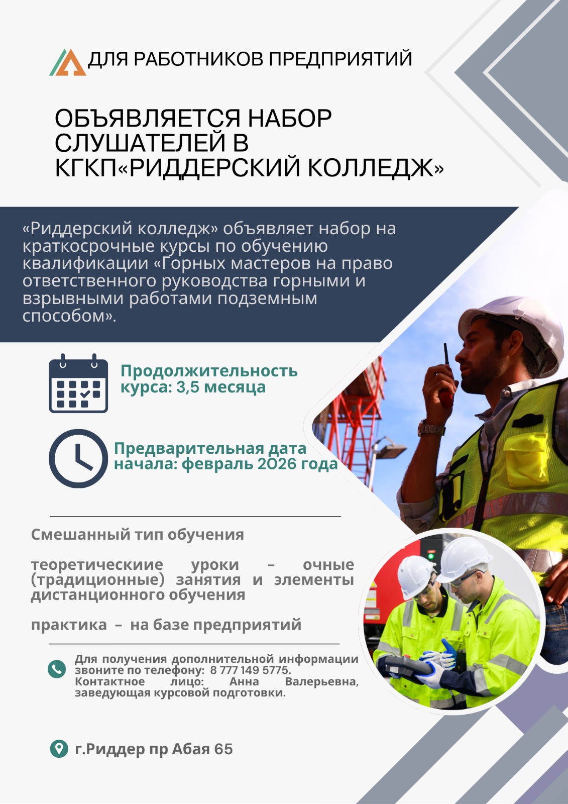 Изменить период Год 20182019202020212022202320242025 2026 2026-03-04 "Стартпрофи-Shygys" стенд-мобы Облыс аудандарында "Стартпрофи-Shygys" стенд-мобы аясында, мектептердің 8-11 сынып түлектері мен жұмыссыз жастар үшін Риддер колледжінің оқытушысы Ф. Е. Уәлиханов Самар ауылы, Күршім ауылы, Маркакөл ауылы, Зайсан қаласы, Тұғыл ауылы, Ақжар ауылы мектептерінде кәсіптік бағдар беру жұмыстарына қатысты, (оқушылардың жалпы қамтылуы 2100 адам болды). Мақсаты -жұмысшы мамандықтарын дәріптеу, оқушыларға оқыту бейінін және болашақ кәсіби қызмет саласын таңдау процесінде қолдау көрсету. 2026-03-02 Плакаттар көрмесі Колледжде «Вандализм — тоқта! Барымызды сақтайық» тақырыбында плакаттар көрмесі өтті. Ұсынылған жұмыстар студенттердің материалдық құндылықтарды, мәдени мұраны және қоршаған ортаны сақтау мәселелеріне жауапкершілікпен қарайтынын көрсетті. Көрме қорытындысы бойынша үздік плакаттар грамоталармен марапатталды. Барлық қатысушыларға белсенділік танытып, шығармашылық көзқарас пен азаматтық ұстаным көрсеткендері үшін алғыс білдіреміз. 2026-03-02 Алғыс айту күні мерекесіне арналған Достық үйінің шығармашылық ұжымдарымен іс-шара Колледж қабырғасында Қазақстанда жыл сайын 1 наурызда атап өтілетін Алғыс айту күніне орай Достық үйінің шығармашылық ұжымдарымен бірлескен мерекелік шара ұйымдастырылды. Аталған іс-шараға колледж студенттері мен оқытушылары белсенді түрде қатысты. Кеш барысында елдегі татулық пен келісімді, өзара құрмет пен ризашылықты дәріптейтін әсерлі шығармашылық қойылымдар мен концерттік нөмірлер ұсынылды. Бұл мереке – халқымыздың бірлігі мен ынтымағын айқындайтын ерекше күн. Мұндай тәрбиелік мәні зор кездесулер жастардың бойында толеранттылықты қалыптастырып, мәдениеттер арасындағы байланысты нығайтуға және студенттік ортаның бірлігін арттыруға ықпал етеді. Достық үйінің шығармашылық ұжымдарына мазмұнды бағдарлама мен жоғары деңгейдегі өнерлері үшін шынайы алғысымызды білдіреміз. Сонымен қатар, шараға атсалысқан барлық студенттер мен ұстаздарға ризашылығымызды білдіреміз. Кездесу көпшіліктің көңілінен шығып, жүректерге жылы әсер сыйлады. 2026-03-02 Алғыс айту күні Қазақстанда жыл сайын 1 наурызда атап өтілетін Алғыс айту мерекесіне орай колледжде қызметкерлер арасында челлендж өткізілді. Алғыс айту күні — адамдарды жақсылық жасауға, бір-біріне құрмет пен ризашылық білдіруге үндейтін ерекше күн. Аталған іс-шара ұжым арасындағы бірлікті арттырып, өзара сыйластықты күшейтіп, қатысушыларға көтеріңкі көңіл күй мен жағымды әсер сыйлады. 2026-02-27 Хабарландыру 2026 жылдың 27.02 Риддер қаласының төтенше жағдайлар қызметі бойынша ақпарат. Ауа температурасы -36 градус Цельсий. Бірінші және екінші курс қашықтықтан оқытуға көшуде Үшінші және төртінші курс студенттері сабақ кестесі бойынша әдеттегідей оқуын жалғастырады 2026-02-27 Есірткіге тәуелділіктің алдын алу Есірткіге қарсы профилактика апталығы аясында колледжде студенттердің құқық қорғау органдарының өкілдерімен кездесуі өтті. Білім алушылар алдында кәмелетке толмағандар ісі жөніндегі инспектор Ілияасов Д.С., криминалдық полиция бөлімшесінің аға жедел уәкілі, полиция майоры Тауханбаев Р.О. және Риддер қаласы ПБ ЖПҚ УИП полиция майоры Рахымжанов М.Е. сөз сөйледі. Әңгіме барысында мамандар есірткі заттарының түрлері, олардың таралу тетіктері және жастардың денсаулығына, психикасы
